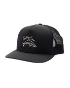 The Catch of the Day Trucker Hat in Black is a water-resistant cap featuring a moisture-wicking internal sweatband. It has a plastic snapback adjuster for a customizable fit and is finished with a Salty Crew clamp label at the back.